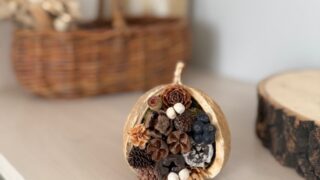 季節の1DAYレッスン クリスマスツリーボックスのご案内です。ぶら下げても可愛い、置いても可愛い。木の実を使ったクリスマスツリー型のフラワーアレンジです。
