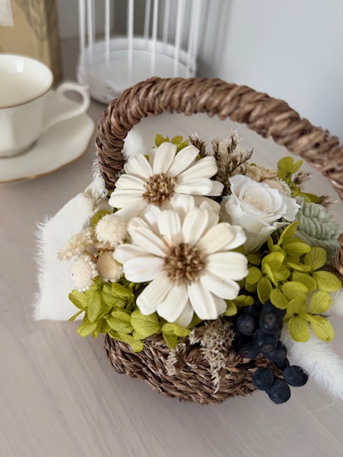 可愛いお花の季節を楽しみながら少しずつ新緑の季節へと向かう植物たち。伸びやかなこの季節にぴったりなグリーンのフラワーバスケットをご用意致しました。マーガレットをメインにプリザーブドフラワー、ドライフラワーと合わせたデザインで仕立てます。季節の1DAYレッスンです。どなたでもご参加いただけます。お花をプレゼントにされる方はラッピングお申しつけください。